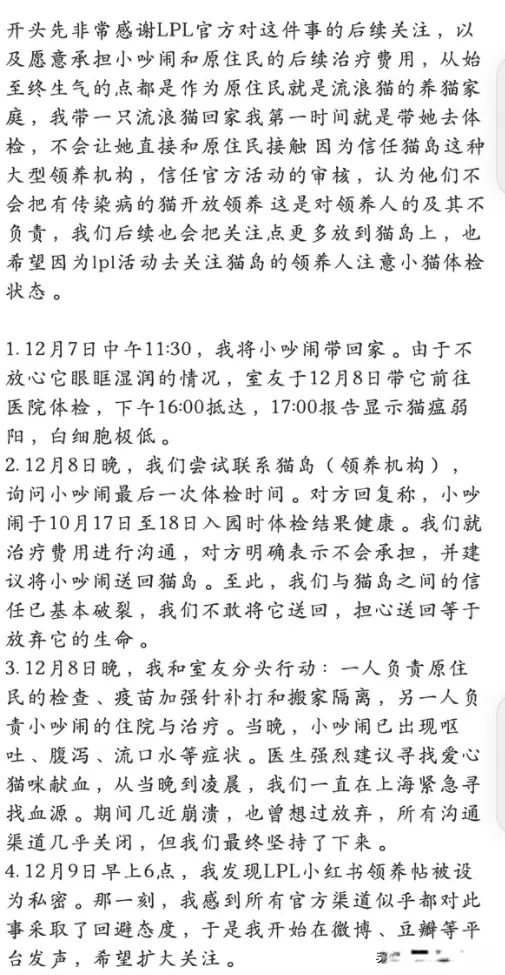 目前,LPL官方已经介入并采取救助措施,这是积极的一步,但仍需要进一步公布调查情况,理清领养前的健康检查是否规范、疫苗流程是否缺失,以及后续如何改进,以免类似事件再次发生。